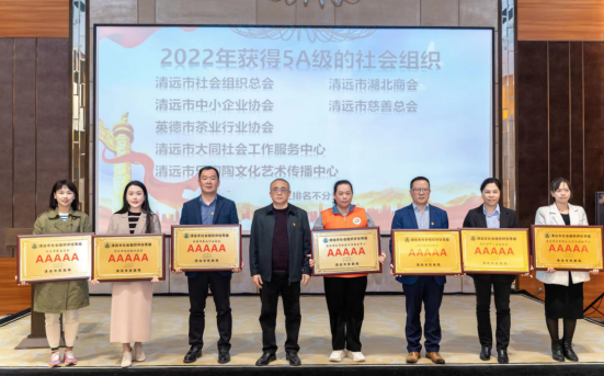 圖為:楊文泳副秘書長(zhǎng)上臺(tái)領(lǐng)“社會(huì)組織評(píng)估5A等級(jí)”牌匾