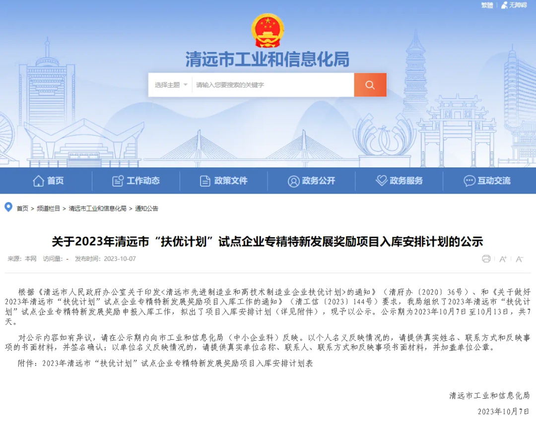 近日,清遠市工業(yè)和信息化局發(fā)布了《關于2023年清遠市“扶優(yōu)計劃”試點企業(yè)專精特新發(fā)展獎勵項目入庫安排計劃的公示》,廣東嘉博制藥有限公司等16家企業(yè)入選2023年“扶優(yōu)計劃”試點企業(yè)專精特新發(fā)展獎勵項目入庫安排計劃,最高入庫獎勵金額為50萬元,合計獎勵金額達到350萬元。