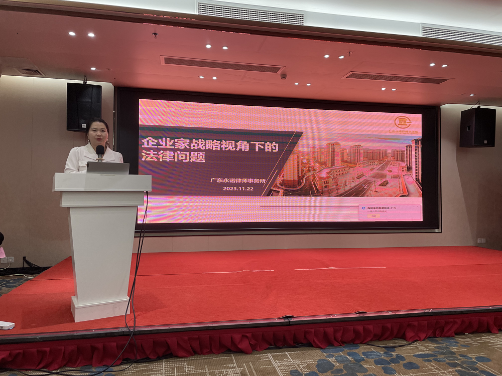 《企業(yè)家戰(zhàn)略視角下的法律問題》專題,由廣東永諾律師事務(wù)所主任王月群主講,王律師通過列舉公司經(jīng)營管理過程中的典型法律問題案例,從專業(yè)法律角度給出具體策略建議。強(qiáng)調(diào)企業(yè)家在戰(zhàn)略決策中需要重視法律風(fēng)險(xiǎn),并通過合法、合規(guī)的方式管理企業(yè)。她探討了企業(yè)經(jīng)營過程中的關(guān)鍵法律問題,為參與企業(yè)提供了解決方案和實(shí)用的操作指南。