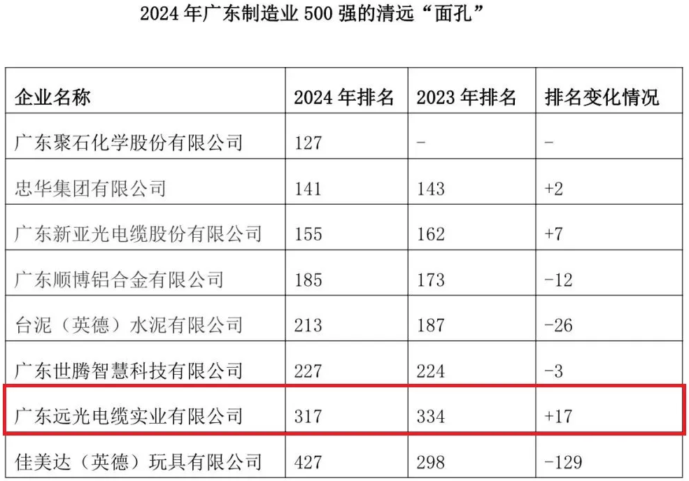 12月3日,廣東省制造業(yè)協(xié)會、暨南大學(xué)產(chǎn)業(yè)經(jīng)濟研究院、廣東省發(fā)展和改革研究院聯(lián)合發(fā)布《2024年廣東制造業(yè)500強企業(yè)研究報告》(以下簡稱《報告》),清遠共8家企業(yè)入選廣東制造業(yè)企業(yè)500強,入選數(shù)量與2023年持平,在全省排名第11位,粵東西北地區(qū)第二。其中,我會會長單位廣東遠光電纜實業(yè)有限公司憑借其在制造業(yè)領(lǐng)域的卓越技術(shù)實力和持續(xù)創(chuàng)新能力,再次脫穎而出,榮登該榜單。